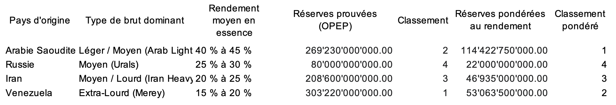Comparons juste le poids des réserves prouvées pondérées à la possibilité de production du produit fini « essence » pour quatre grands producteurs mondiaux :